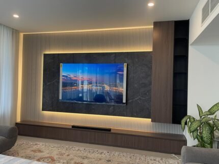 This elegant living room showcases a sophisticated TV wall design that seamlessly combines modern aesthetics with timeless luxury. The feature