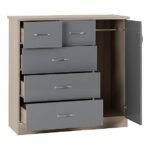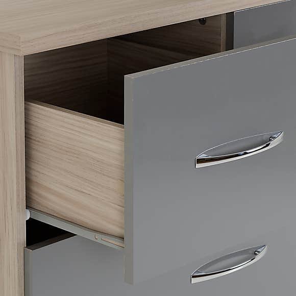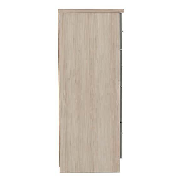 The gloss finished front of the Grey 5 Drawer Compact Wardrobe, which contrasts beautifully with the light wood veneers, gives it a modern appearance. The five drawers and hanging space on the metal rail of the Nevada will meet all of your storage requirements.