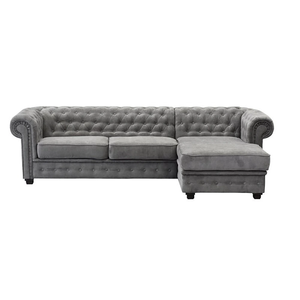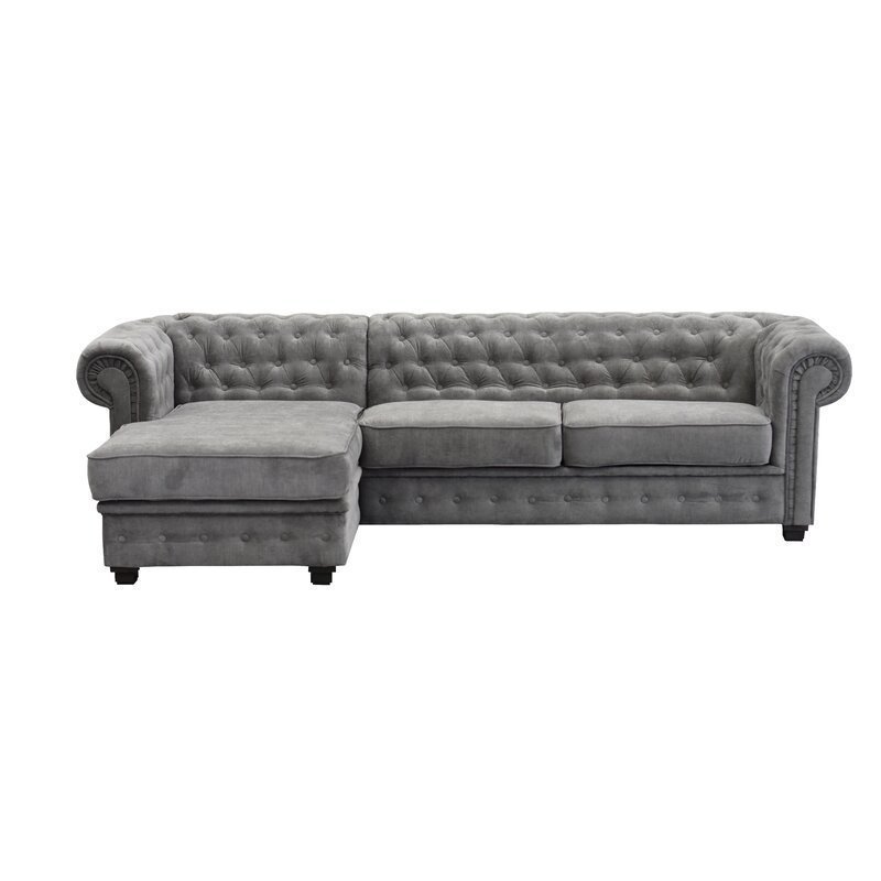 This roomy corner couch looks great in both traditional and modern settings, and it can comfortably seat four people. It features rolling arms with button-tufted accents, a high back, and a sophisticated L shape. This couch has velvety cushioning, sinuous springs, and soft woven fabric.