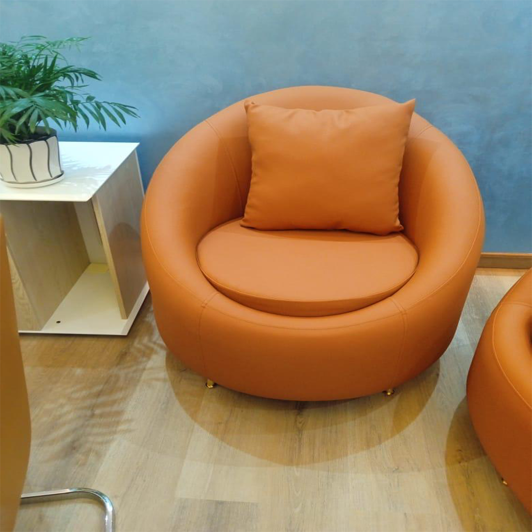 The Amber Halo Lounge Chair is a refined blend of contemporary style and everyday comfort, designed to elevate modern interiors. Showcasing a smooth, circular silhouette, this chair is upholstered in a warm amber-toned fabric that adds a bold yet sophisticated touch to any space. The generously cushioned round seat and supportive curved backrest create a cozy, wraparound seating experience, while the matching accent cushion enhances comfort and visual balance. Compact in size but strong in character, it is ideal for living rooms, bedrooms, offices, waiting areas, and boutique lounges. Subtle metallic legs provide stability and a touch of elegance without overpowering the design. Perfect for those searching for a modern lounge chair, round accent chair, designer seating, or luxury upholstered chair, the Amber Halo Lounge Chair delivers standout aesthetics, superior comfort, and timeless appeal in one stylish piece.