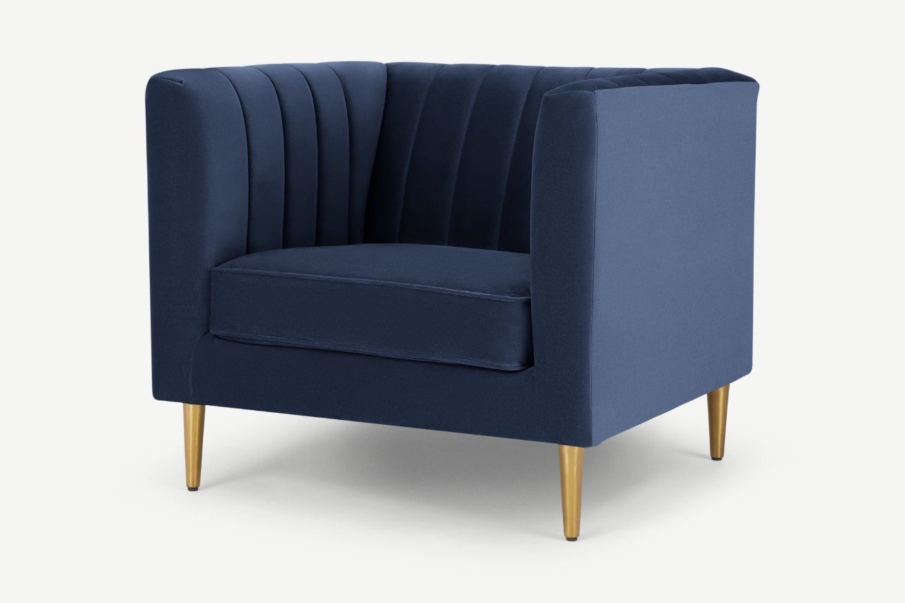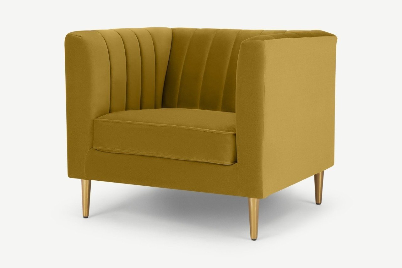 The square frame, covered in velvet and with a cute channeled backrest, lends Amicie’s mid-century influence a modern, fresh vibe. Take note of the tapering metal legs and narrow, curved arms of this armchair. Both comfy and impressive.