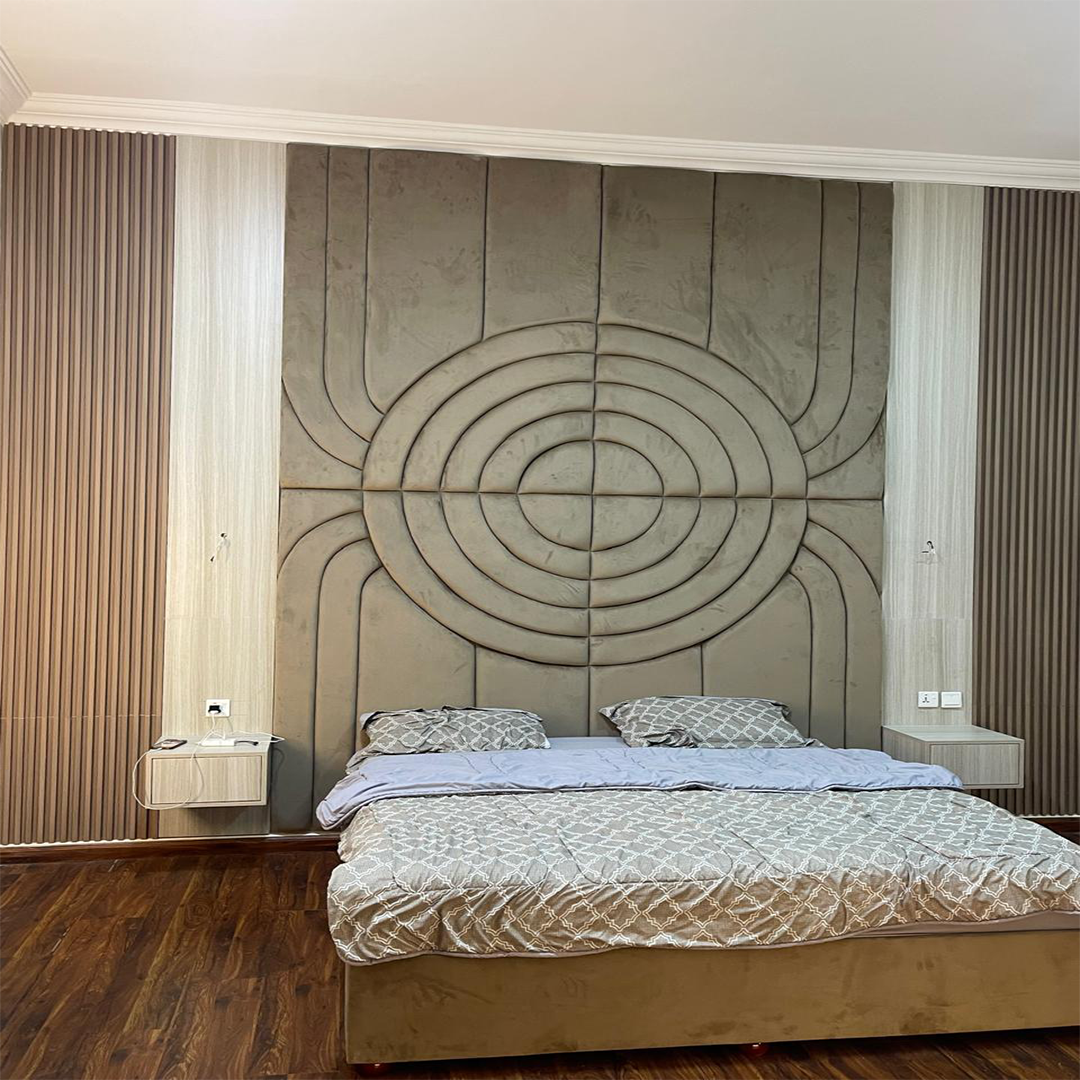 The Arc Harmony Master Bedroom Design is defined by its bold, sculpted upholstered headboard. The layered circular arc pattern creates a strong visual centerpiece while maintaining softness through fabric texture.
