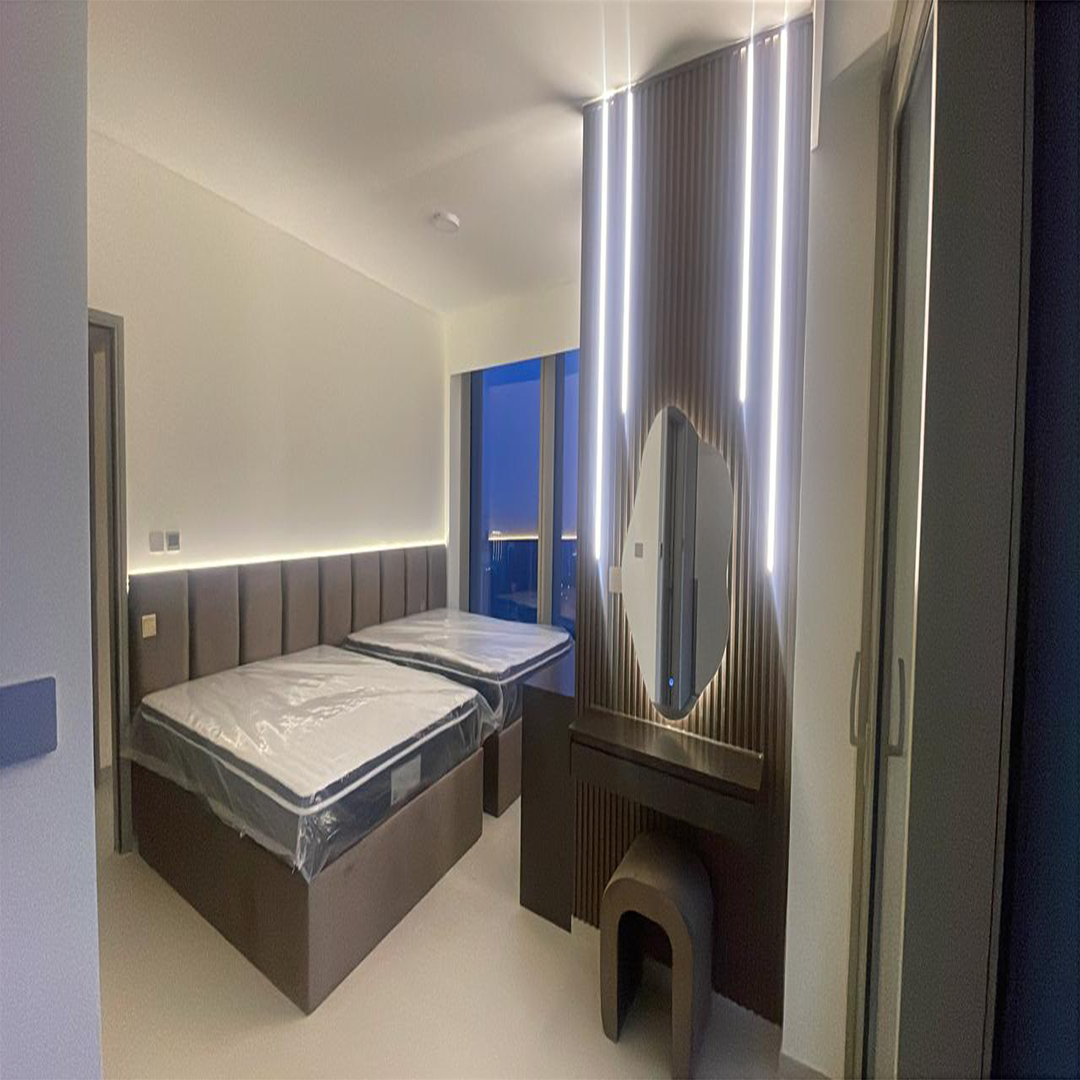 A concealed LED light strip runs along the headboard, creating a soft glow. Therefore, the space feels relaxing and well-balanced during evening hours. The lighting highlights the headboard design while avoiding harsh brightness. Moreover, it adds a premium hotel-inspired touch to the room.