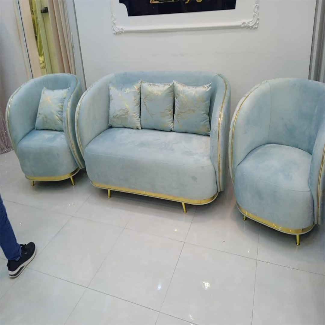 The Aurelia Luxe Velvet Sofa Set is designed to bring refined elegance and modern luxury into your living space. Featuring a beautifully curved silhouette, this sofa set includes a compact two-seater paired with matching accent chairs, creating a balanced and sophisticated seating arrangement. The soft pastel velvet upholstery adds a calm, premium feel, while subtle gold detailing along the edges and legs enhances its upscale appeal.