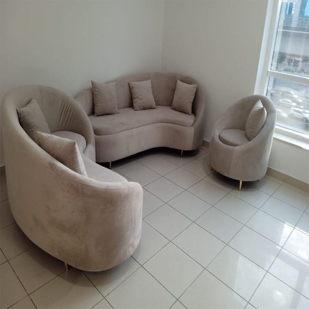 The Blush Aura Lounge Sofa Set brings soft elegance and modern comfort to compact living spaces. Featuring a beautifully curved loveseat paired with two matching accent chairs, this sofa set is upholstered in premium blush-beige velvet that adds warmth and luxury to any interior. The smooth rounded silhouettes, plush seat cushions, and supportive back pillows create a cozy yet refined seating experience. Slim metallic legs enhance stability while giving the set a light, contemporary look. Ideal for apartments, bedrooms, offices, or lounge corners, this sofa set is designed to maximize style without occupying excess space. Its neutral tone blends effortlessly with modern, minimalist, and luxury dƩcor themes. Durable upholstery and high-density cushioning ensure long-lasting comfort and easy maintenance. Perfect for those searching for a modern sofa set, velvet lounge sofa, compact seating solution, or stylish living room furniture, the Blush Aura Lounge Sofa Set delivers timeless design with everyday functionality.