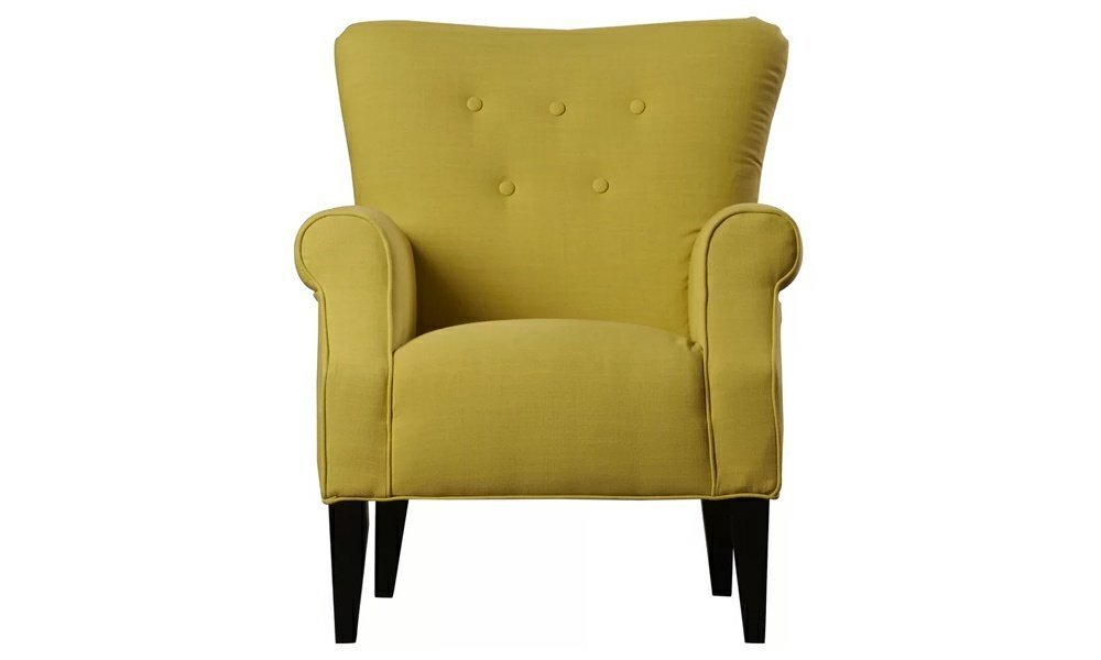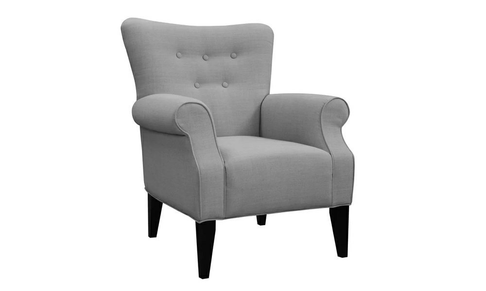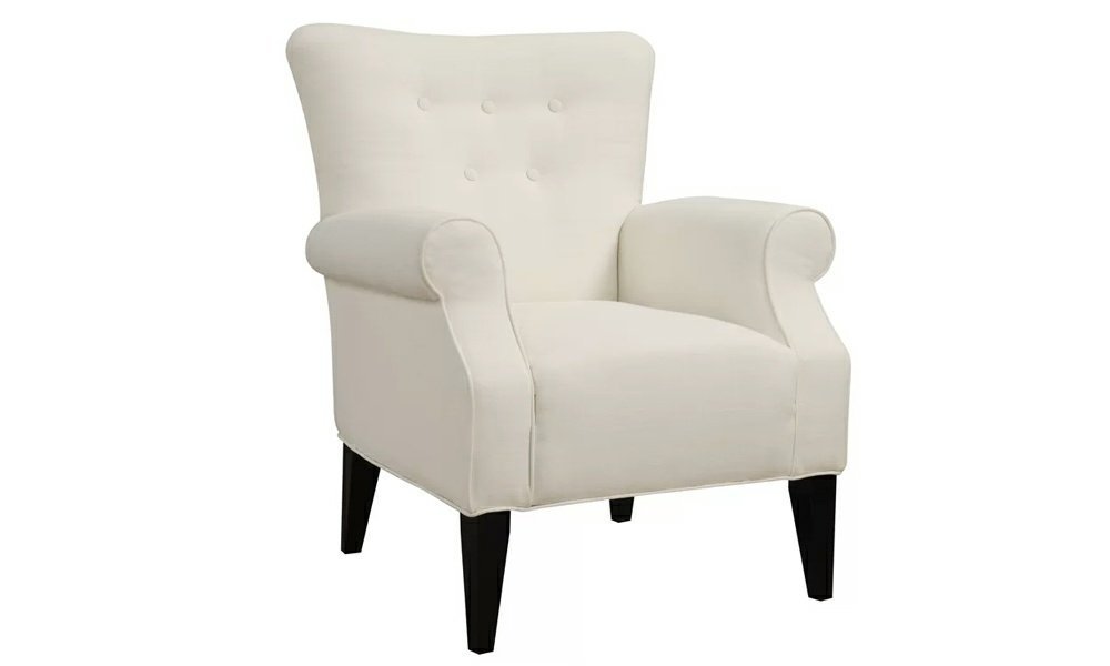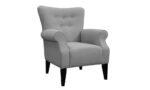 The chair has a flared arm design that is transitional and is upholstered in a plush fabric of a varied color. This chair has a tufted back and a simple, plush seat and back. This essential arm chair will add life to any room thanks to its eye-catching fabric and button tufting.