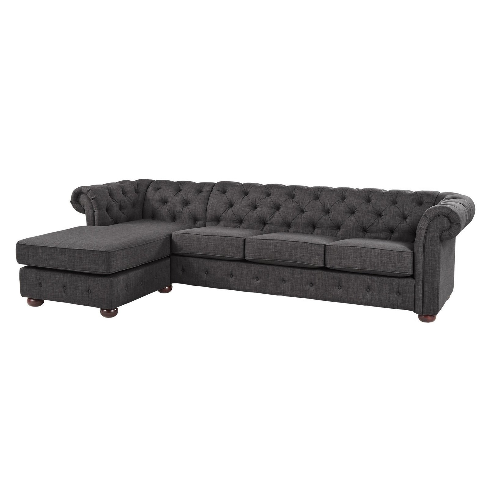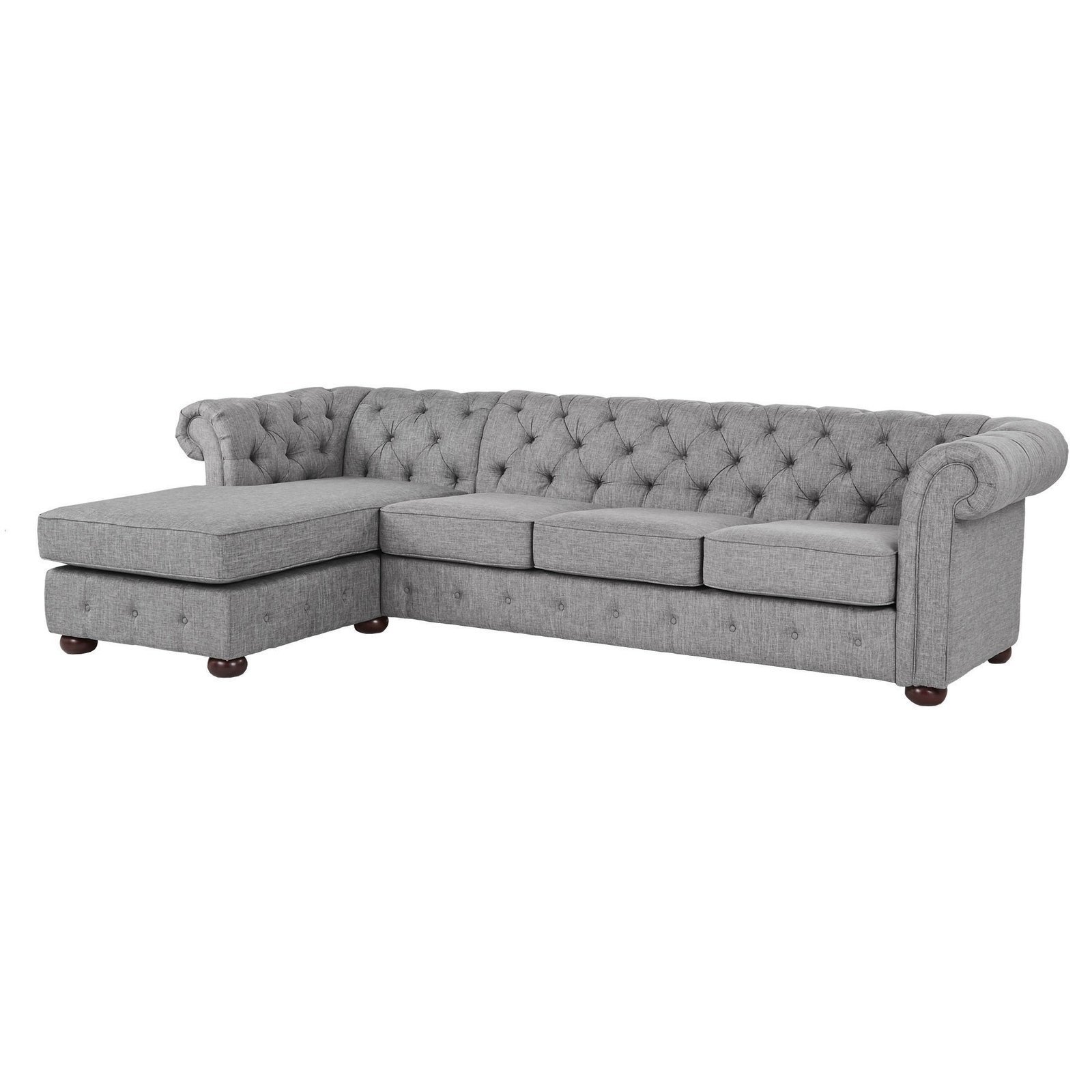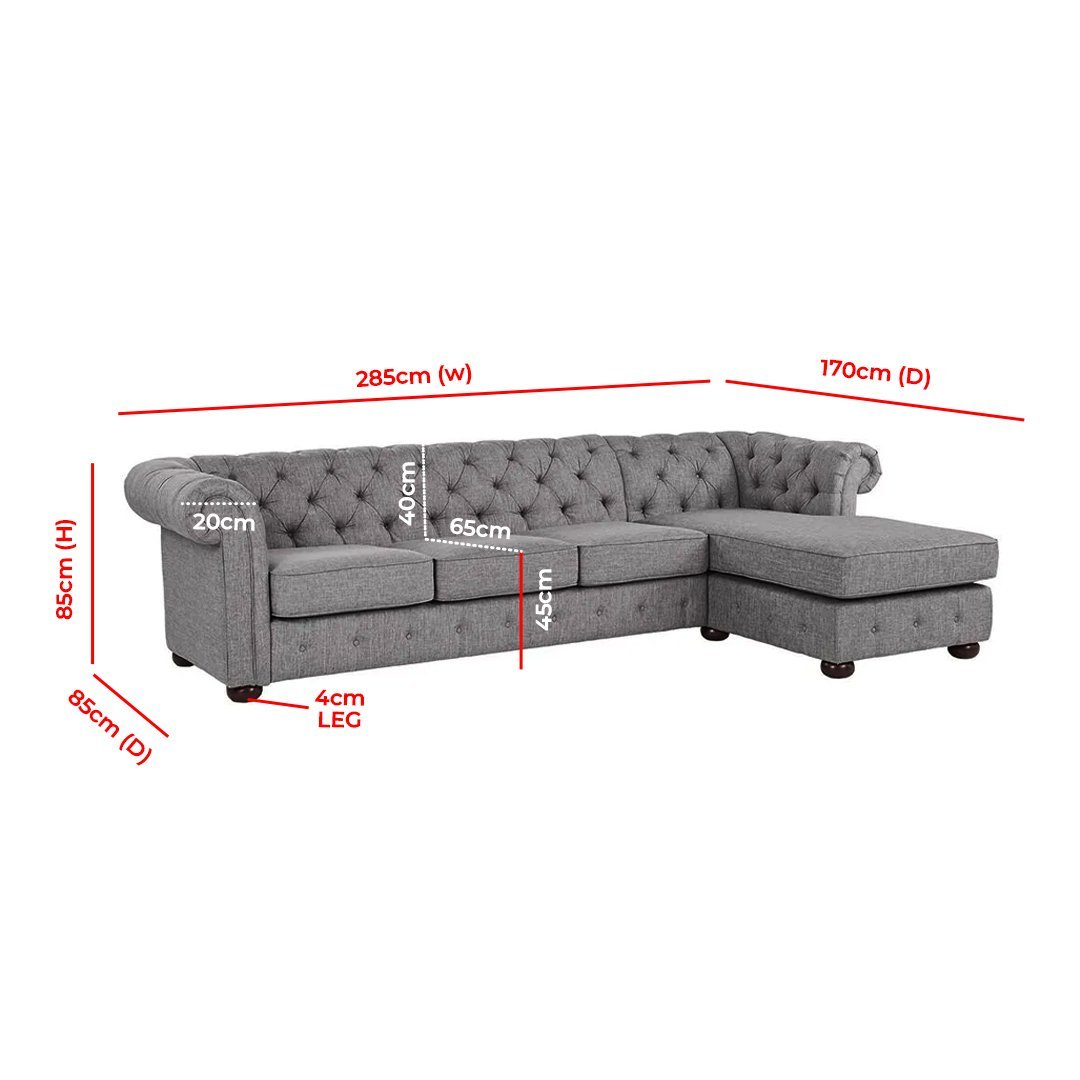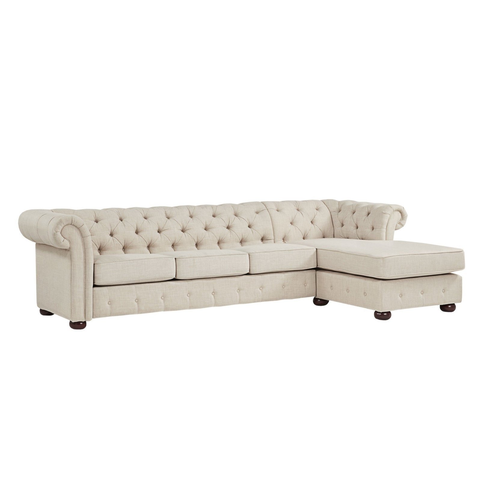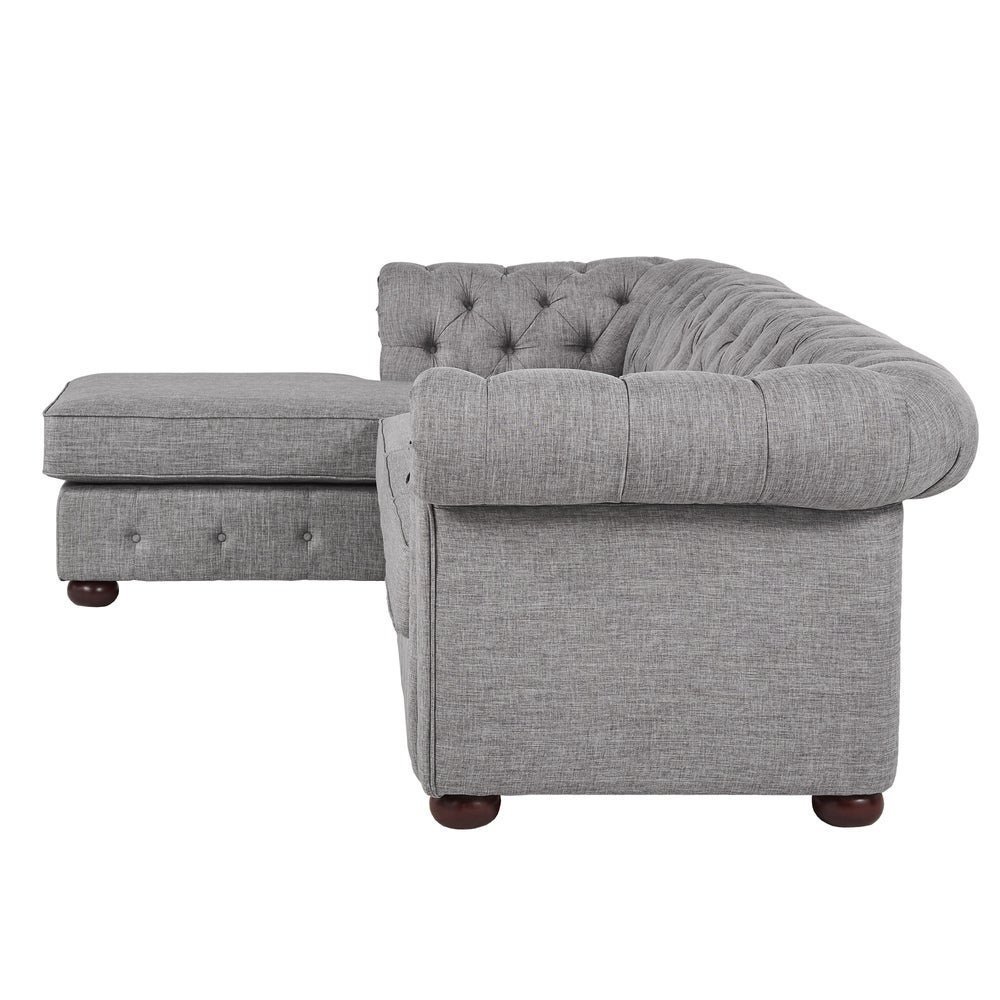 Comfort’s four-seat couch and chaise allow you to furnish your living area with plush seating. Button tufting on the low, rolling back, and arms gives the design a hint of traditional refinement. Either facing left or right, the chaise is perfect for unwinding with a book or a TV show. Upholstery made of linen is available in beige, grey, or dark grey. Arms and backs were tufted and rolled.