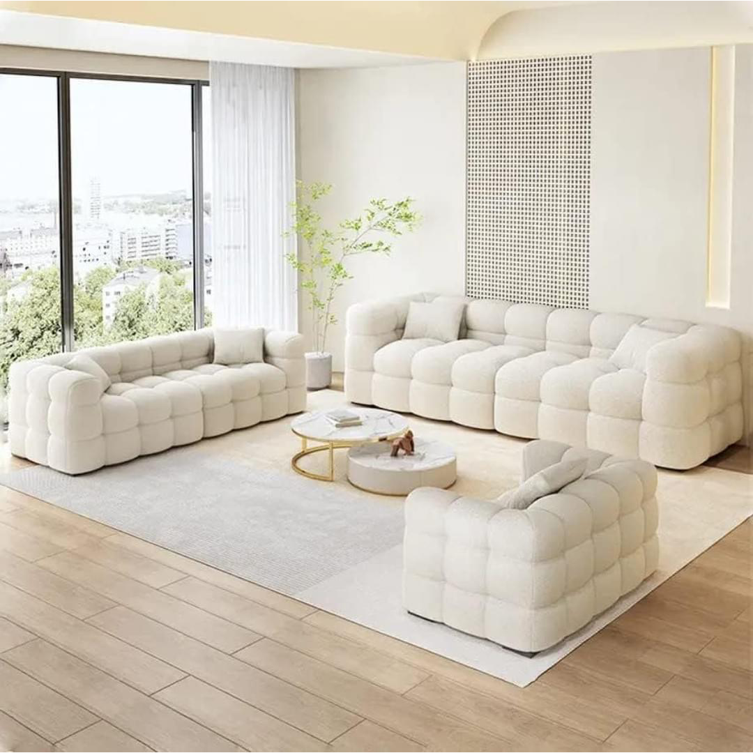 The Cloudora Modular Lounge Sofa Set is designed to bring modern comfort and visual harmony into your living space. Featuring a soft, cloud-inspired silhouette with evenly padded block-style cushioning, this sofa set delivers a cozy yet refined seating experience. Its modular layout allows flexible arrangement, making it ideal for both large living rooms and open-plan interiors. Upholstered in premium, soft-touch fabric, Cloudora offers a smooth texture that feels inviting while maintaining durability for everyday use. The deep, generously cushioned seats provide excellent support, perfect for long lounging sessions or family gatherings. The neutral tone blends effortlessly with minimalist, contemporary, and luxury interiors, creating a calm and elegant atmosphere. Built on a sturdy internal frame with high-density foam, this sofa set ensures long-lasting comfort and shape retention. Ideal for customers searching for modular sofas, modern lounge sofas, or luxury fabric sofa sets, the Cloudora Modular Lounge Sofa Set combines style, flexibility, and everyday comfort in one timeless design.