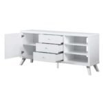 Round knobs and clean lines complement the majority of house decors. To keep your CDs, remote controls, and periodicals organized, it contains three tiers of open shelving in the right and one cabinet in the left. The legs provide a light, airy appearance and make it simple to clean the floor underneath. This TV stand is the ideal synthesis of excellent construction, creative design, and useful utility. With 3 open shelves, 3 drawers, and 1 concealed cabinet, this piece of furniture offers the maximum amount of storage space for storing DVDs, board games, gadgets, and media accessories.