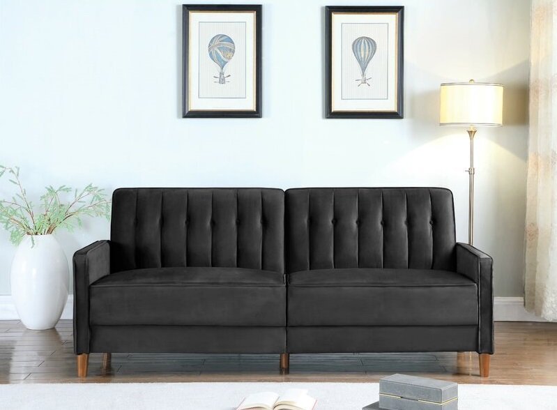 This is a stylish, comfortable couch that combines modern and contemporary design elements. This gorgeous couch pairs well with the club chair from the same collection or looks great on its own. It features protective arms covered in plush velvet and a button cushion with channel quilting. Adapts to the office, den, living room, and lounge’s modern and contemporary design themes.