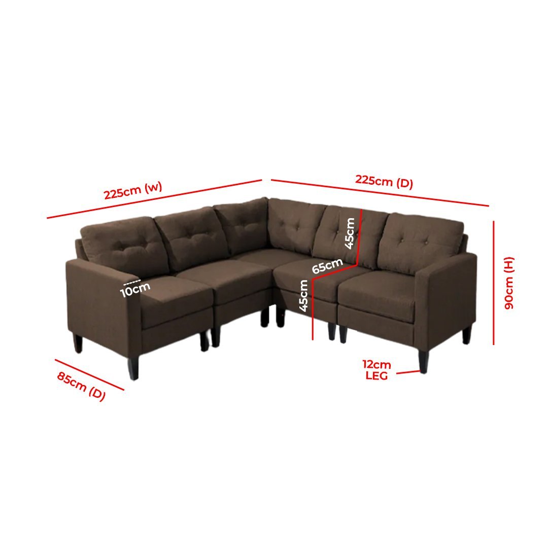 When you furnish your living room with this five-piece sectional sofa, you will have plenty of seating for guests. This sectional sofa is made of soft fabric and includes a corner chair, armless seats, and a left-arm chair with a mid-century vibe. You can arrange it however you want to recline in comfort.