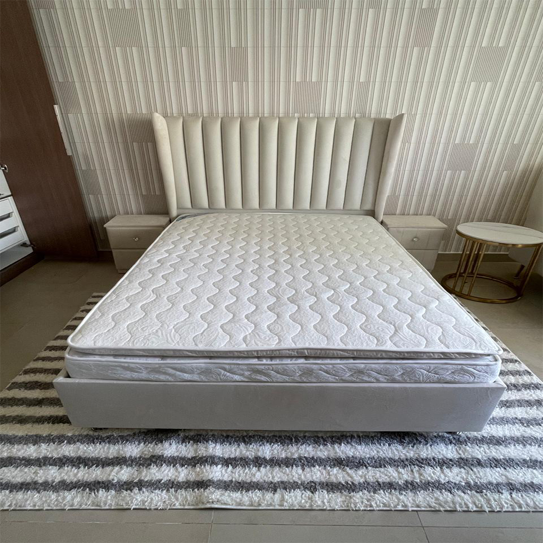 The Ivory Crest Bed is a refined blend of modern comfort and timeless bedroom elegance. Designed with a tall vertical- headboard, this bed creates a strong visual statement while offering excellent support for sitting, reading, or relaxing. The gently winged sides of the headboard add a touch of sophistication and enhance the overall structure of the design.