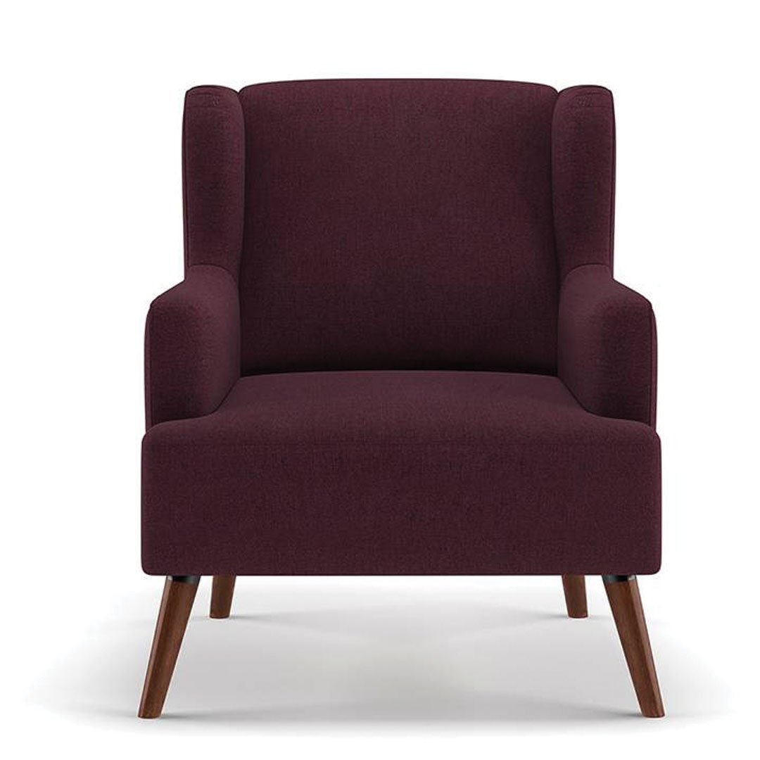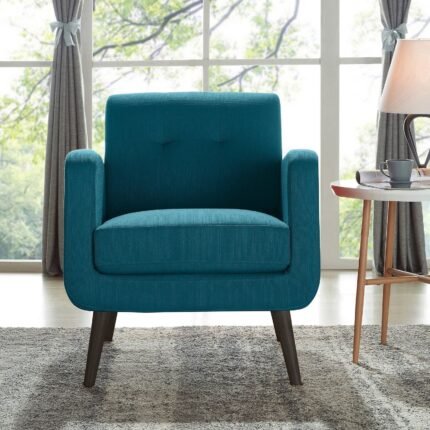 This contemporary arm chair, which oozes mid-century design, features soft, comfy seats covered in a tough, easy-to-clean polyester fabric. Walnut-finished angled legs add to the fashionable retro-modern design of today.