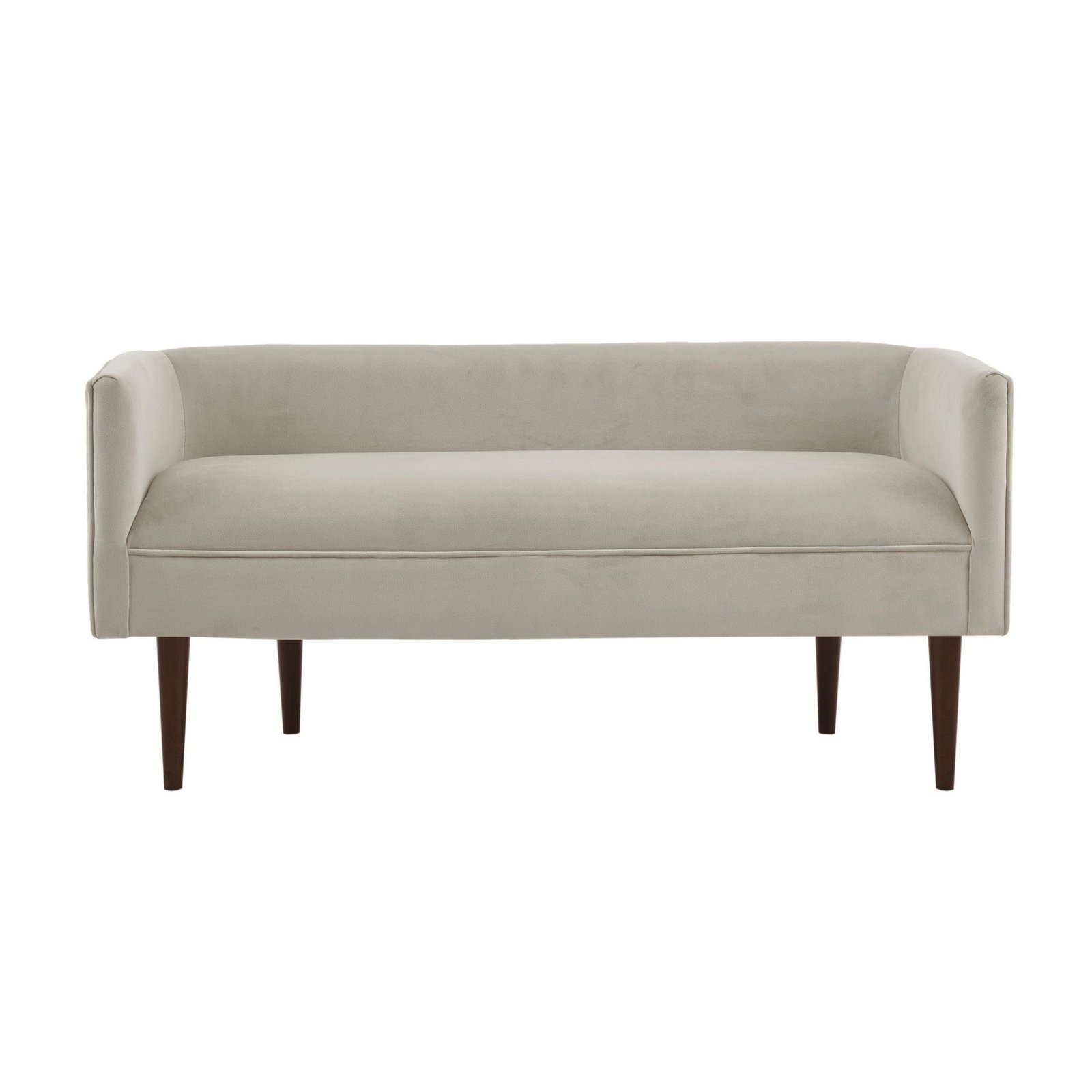 This elegantly designed bench adds a fashionably unique touch to your living room or entryway. This accent bench is upholstered in a rich cream velvet fabric and has a low back and sides for a stylish transitional look. The solid wood legs have a dark brown finish that adds a striking contrast to the upholstery.
