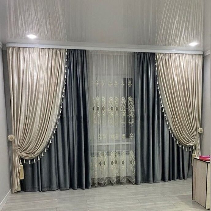 Add opulence to your interior with this Luxury Satin & Velvet Curtain Set, featuring a lavish combination of shimmering champagne satin drapes, deep charcoal velvet blackout panels, and intricately embroidered sheer curtains. Accented with elegant tassel trims and tiebacks, this set creates a sophisticated focal point in any room. Perfect for formal living rooms, master bedrooms, or grand interiors, this curtain set merges classic charm with modern drama.