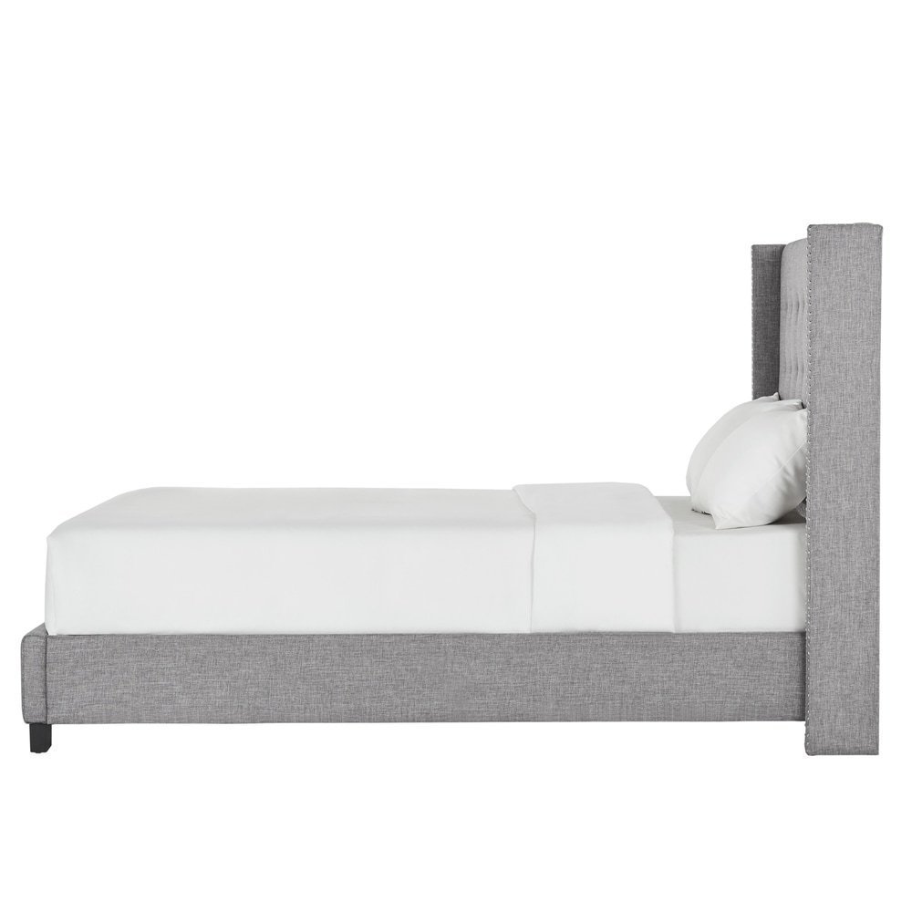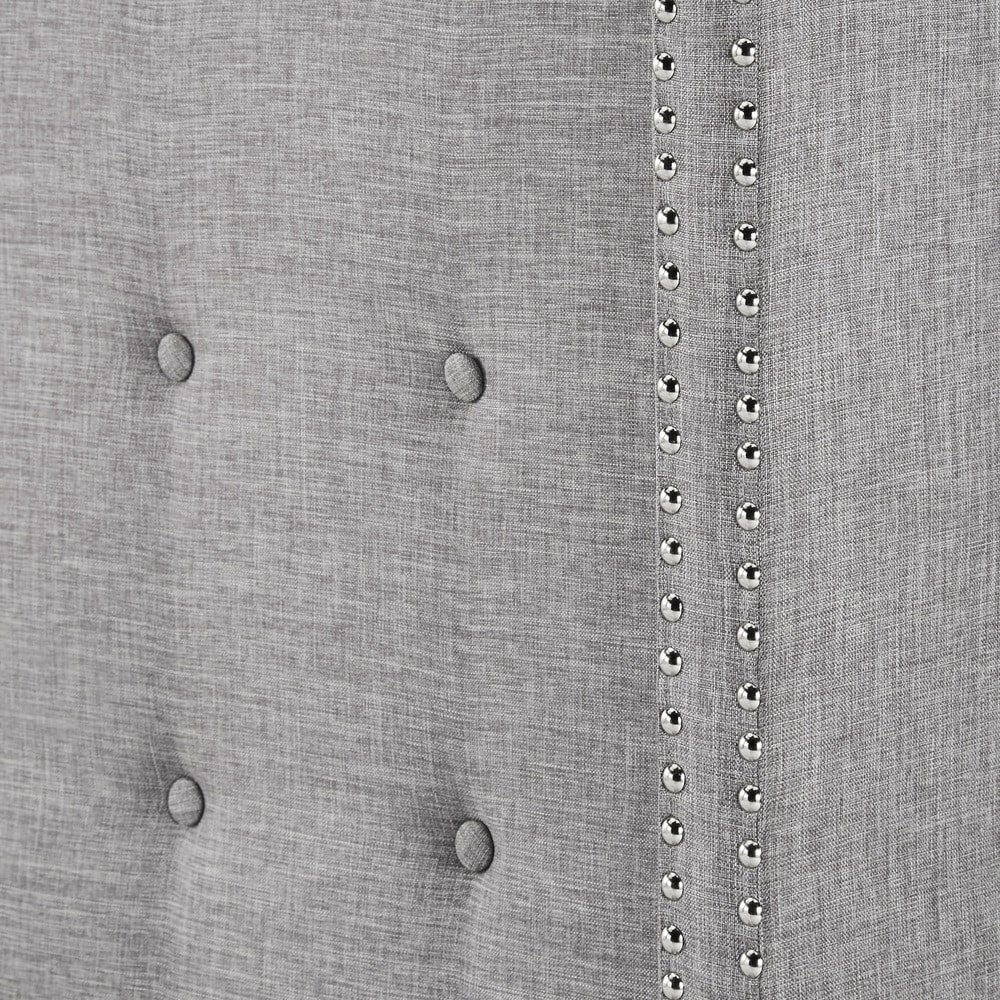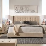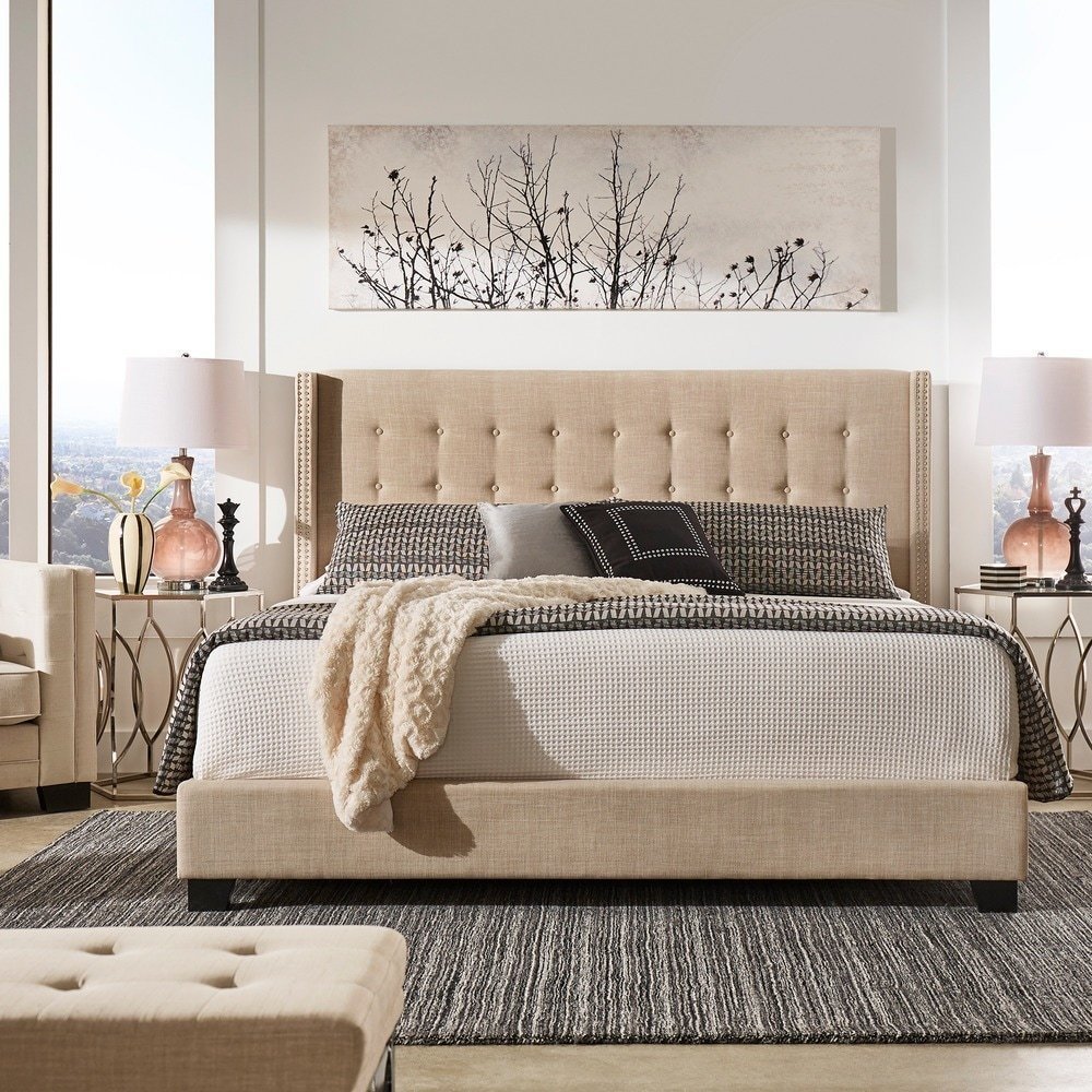 With this magnificent bed, your bedroom will be elevated. The bed adds classic elegance to any decor with to its wingback style, button tufting, and two rows of silver nail head trim. The bed readily matches your style because it comes in beige, dark grey, or grey.