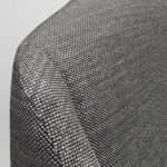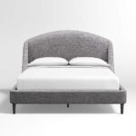 The luxurious contours of a French-style chaise are streamlined into an upholstered bed for the contemporary bedroom. The bed flows down from the softly rounded headboard to thin rails that delicately slope to form the lower-profile footboard. The bed is entirely upholstered in a misty linen-like fabric. The grey finish on the turned, solid wood legs matches the fabric and keeps the design looking new and contemporary.