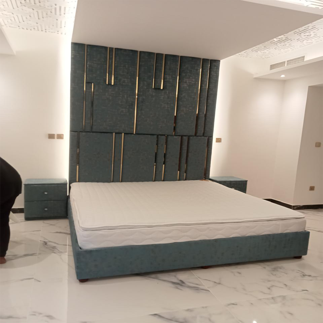 A thoughtfully designed bed brings structure and comfort to a modern bedroom. This upholstered bed from Zain Furniture presents a bold yet balanced design, created for premium residential interiors. The deep teal upholstery combined with a detailed headboard wall creates a strong visual presence while maintaining a calm and refined atmosphere.
