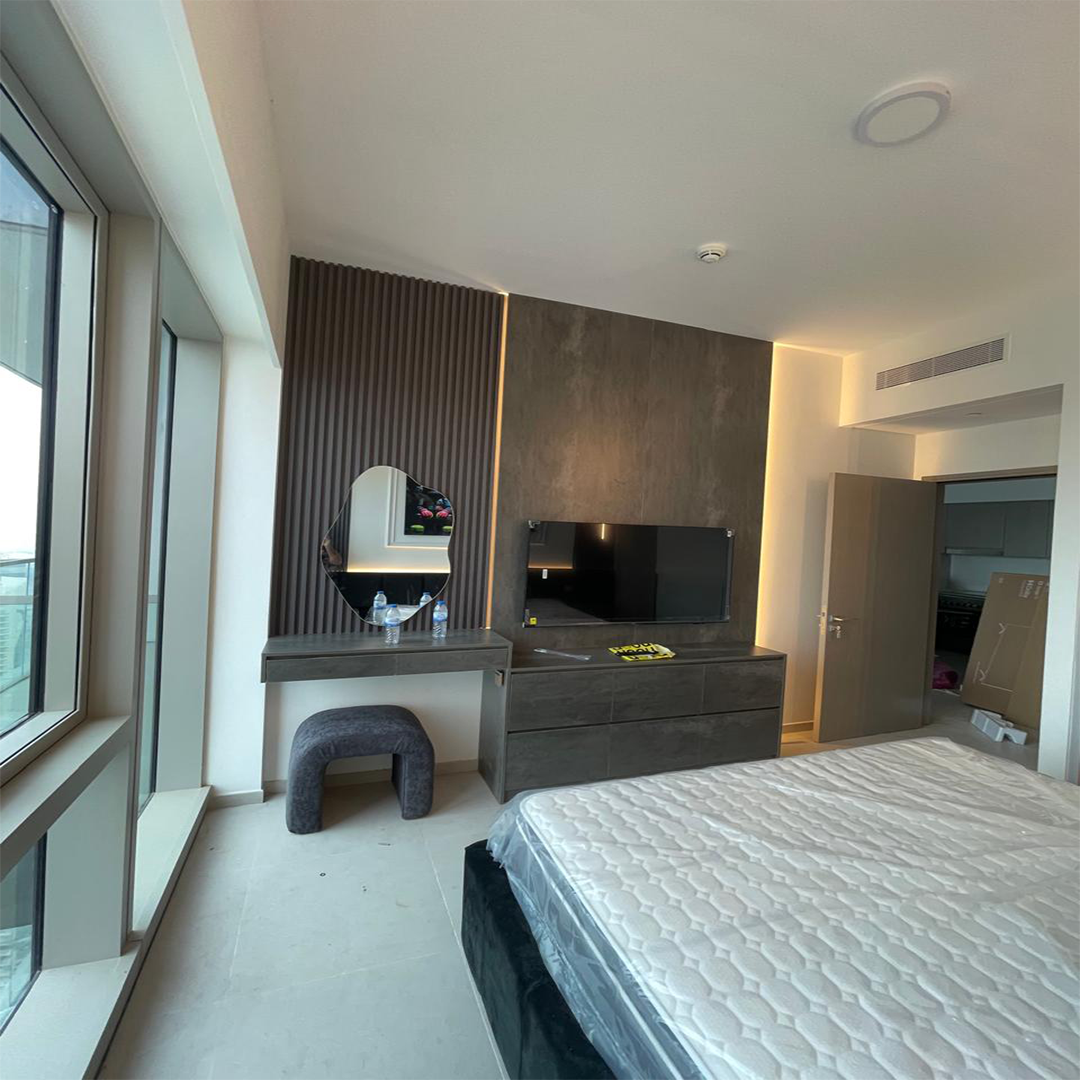 The vertical panel backdrop adds depth and texture, while the integrated LED lighting provides soft, balanced illumination for makeup and daily grooming. Its floating tabletop keeps the area visually light and clutter-free, offering just enough space for essentials and dƩcor. Paired with a comfortable upholstered stool, the setup ensures both functionality and comfort.