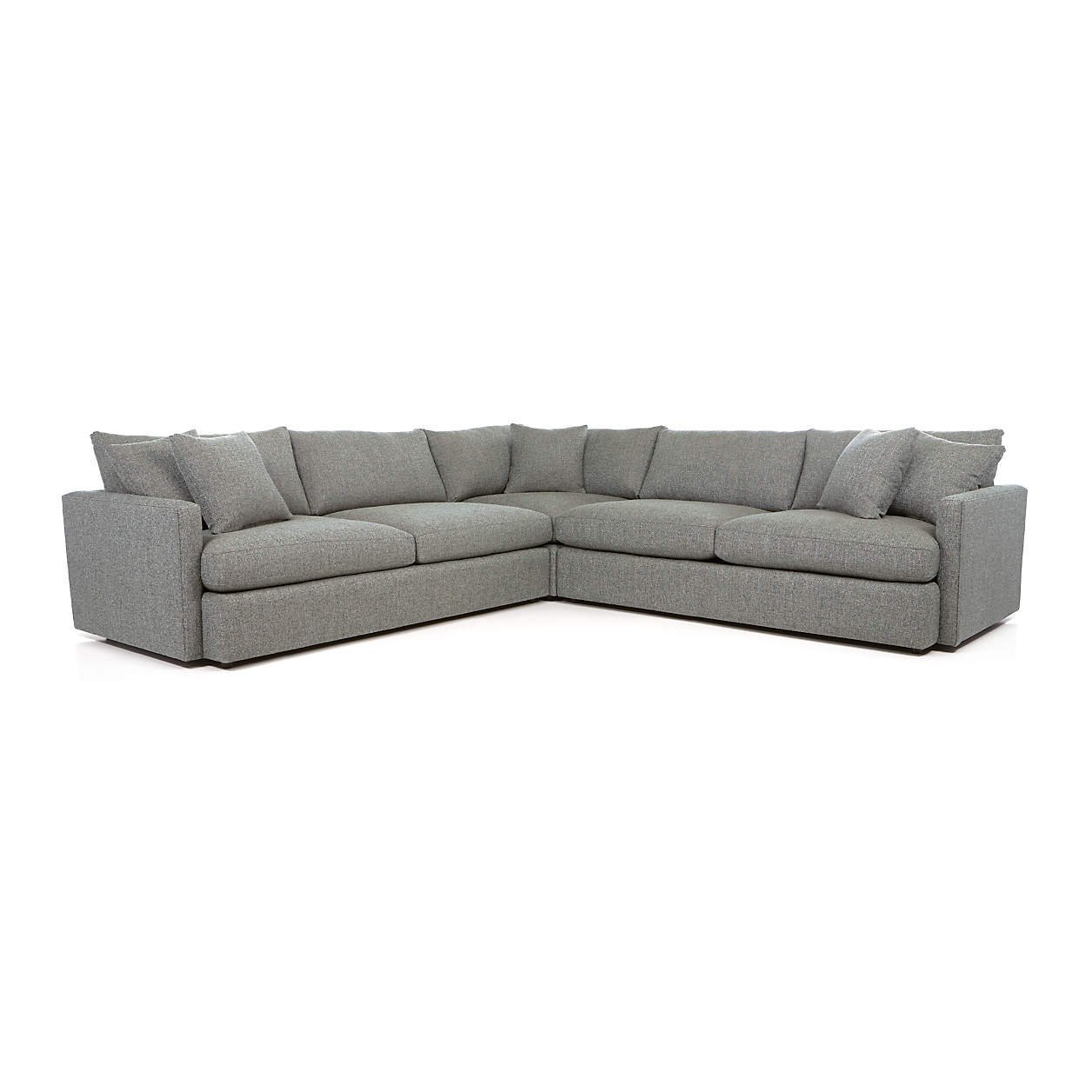 The three-piece sectional sofa consists of a right-arm sofa, a corner, and a left-arm sofa. It has super-deep, low seats and super-soft back pillows that encourage family members to cuddle up. Modern track arms with slim, sleek lines make it simple to use and maximizes your sitting area. This makes it ideal for watching movies or binge-watching your favorite TV series.