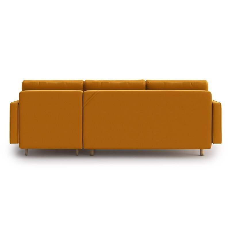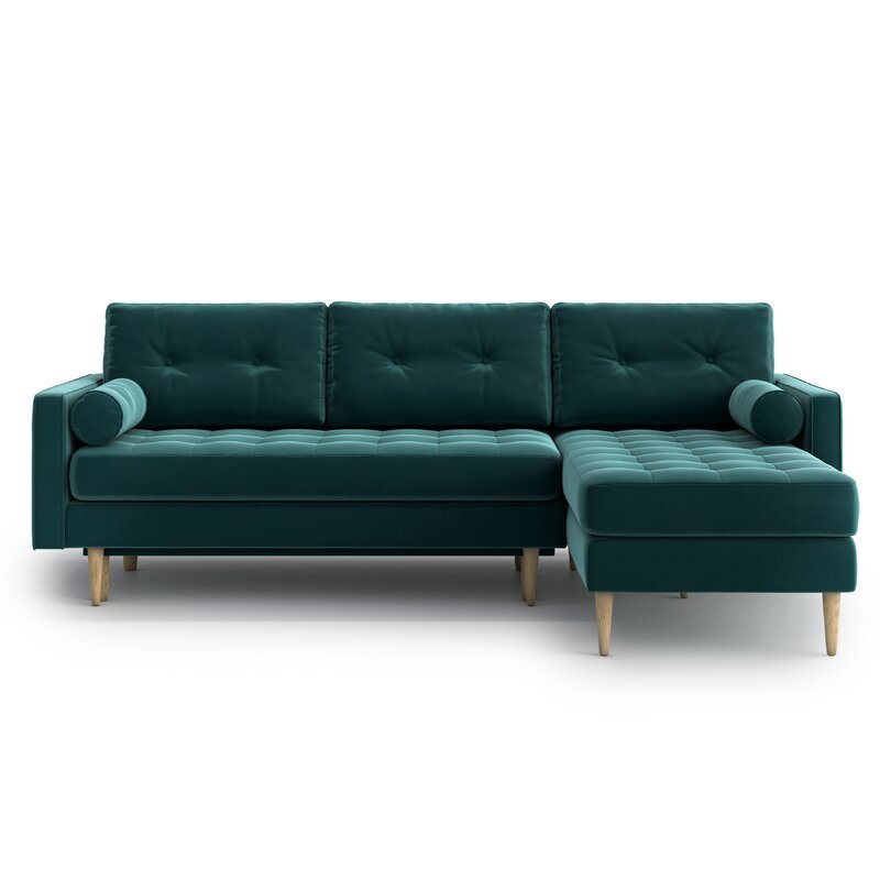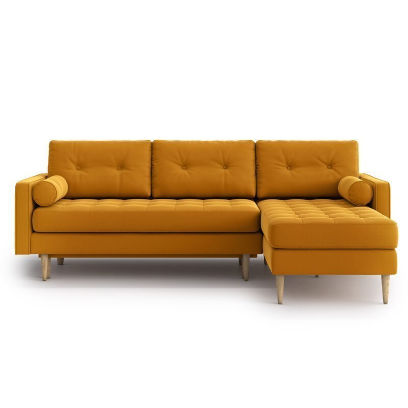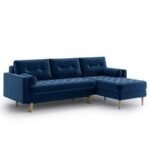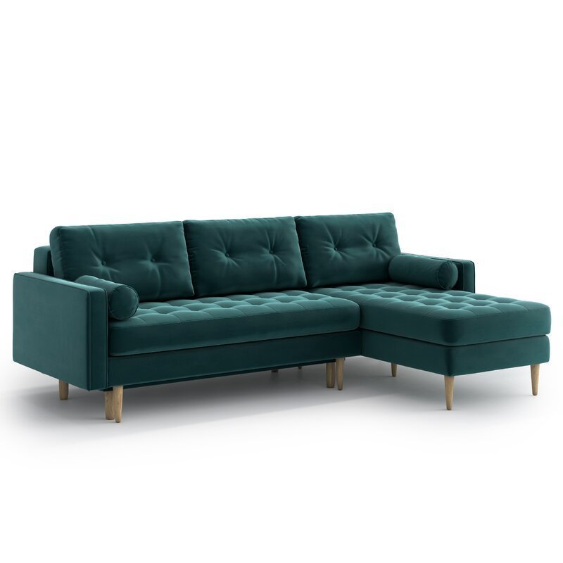 This corner couch, which is as functional and inviting as it is elegant, will add a touch of mid-century glam to your home. The couch has an old Hollywood look and comes in a variety of colors to complement your current decor. It features velvet-like fabric, wooden legs, and throw pillows that are already included.