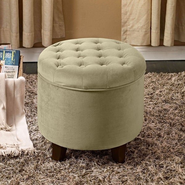 With this circular storage ottoman, you may have storage without sacrificing beauty. Use as a storage ottoman to conceal accessories in a bedroom, keep remote controls or game controllers close by but out of sight, or to store books or magazines in a living room. Combine two for more impact. This tufted ottoman comes with complementary accent pieces in the same color and is available in a variety of rich velvet hues.