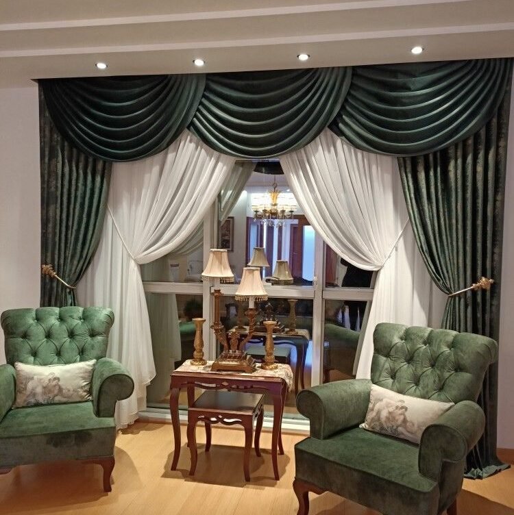 Elegant emerald green velvet drapes with white sheer panels