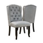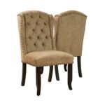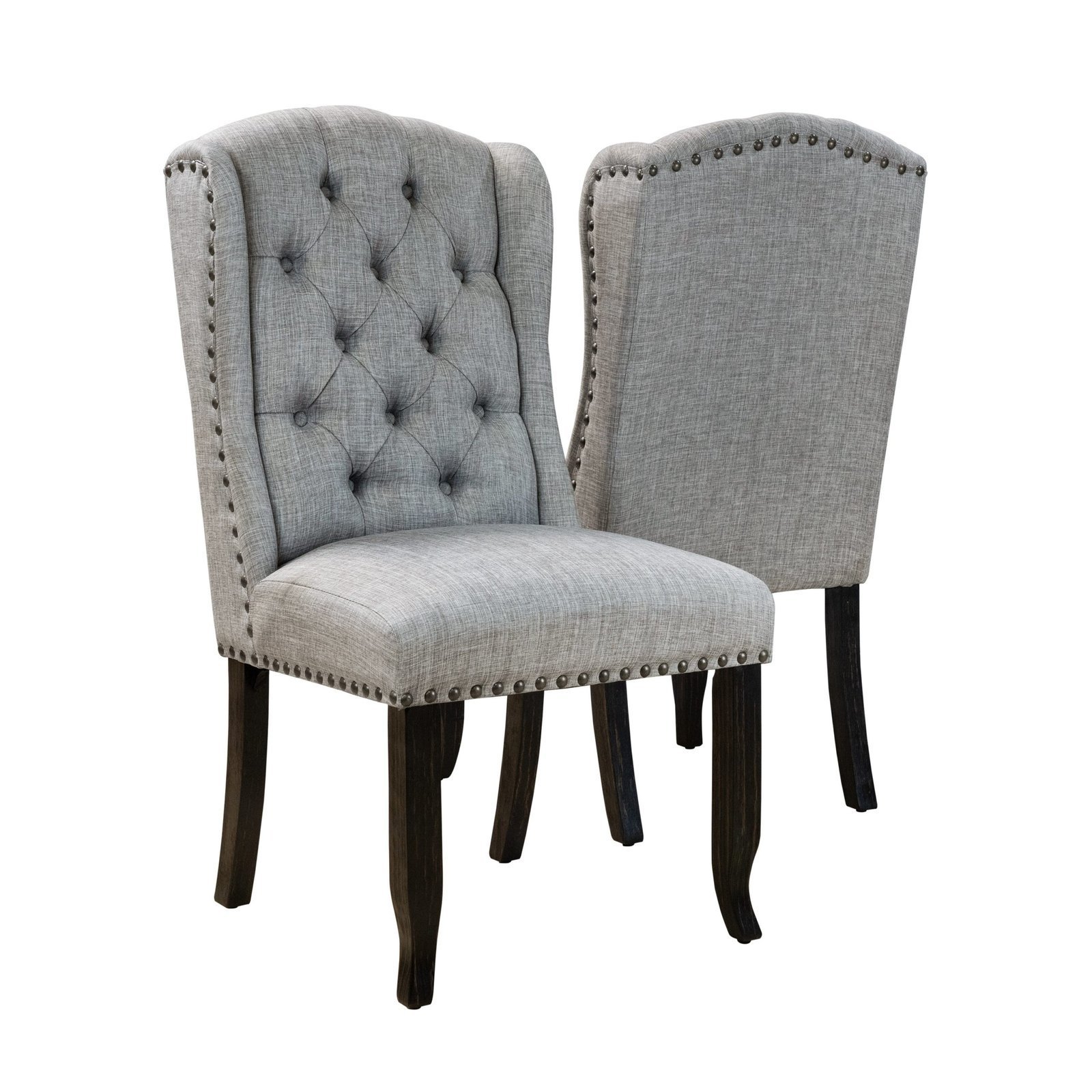 With these classic Tays dining chairs from Furniture of America, you can breathe new life into your farmhouse decor. The button-tufted wingback seats on the espresso-finished frames are covered in polyester with a linen-look fabric for simple maintenance. Choose from five distinct upholstery colors that each have brass nail head trim as an accent.
