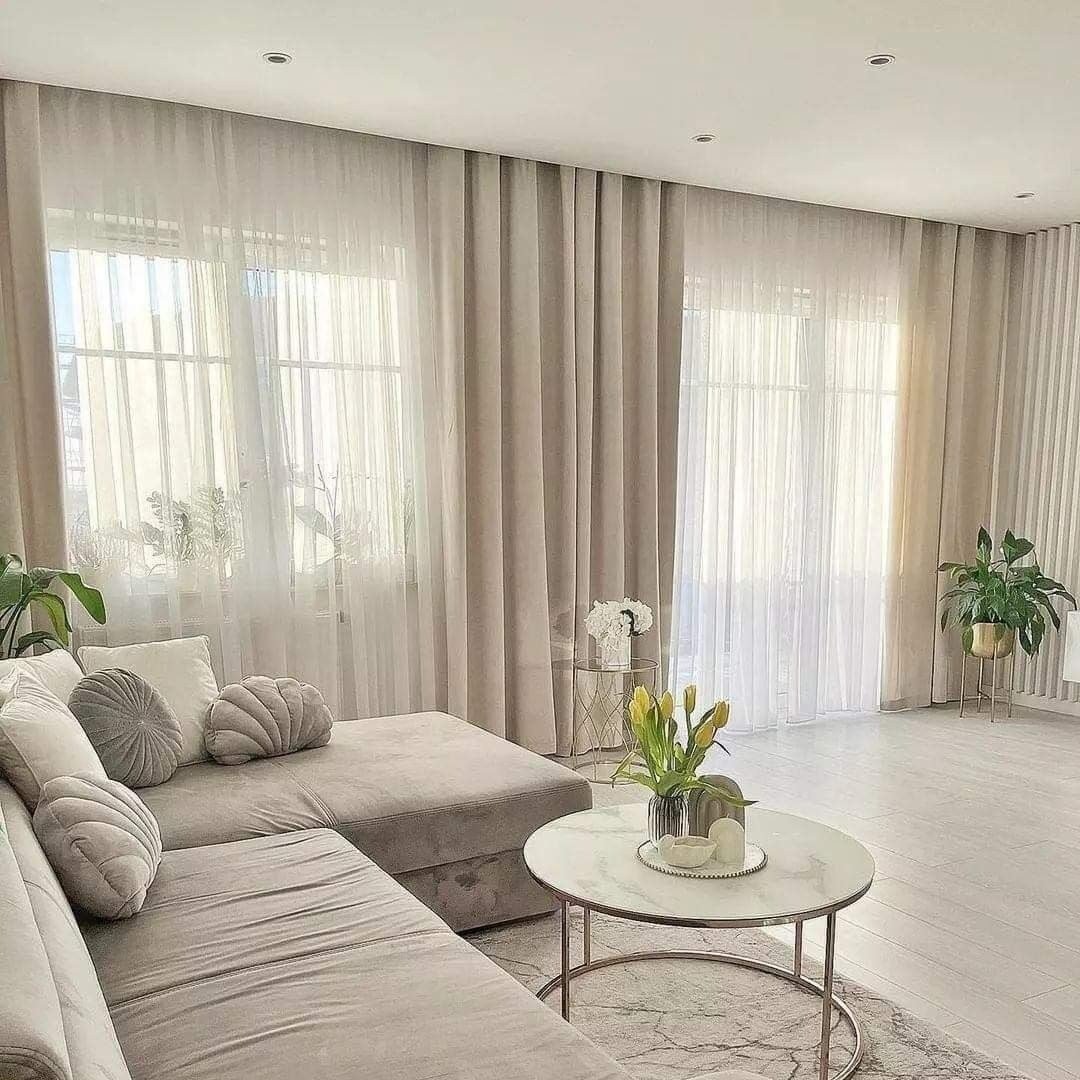 Elevate your living space with the Serenity Luxe Living Room Set, a harmonious blend of comfort and contemporary elegance. This set features a plush, L-shaped sectional sofa upholstered in soft, neutral-tone velvet, complemented by a round marble-top coffee table with a sleek gold metal base. Delicately layered floor-to-ceiling curtains and sheer drapes allow for an airy, light-filled ambiance, while curated accent pillows and fresh floral arrangements add the perfect finishing touch. Ideal for modern, minimalist interiors that value both style and serenity.