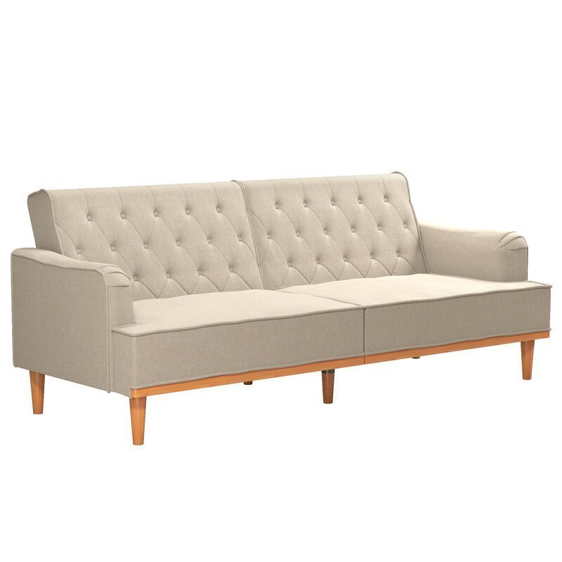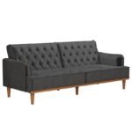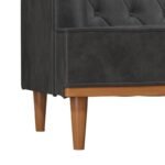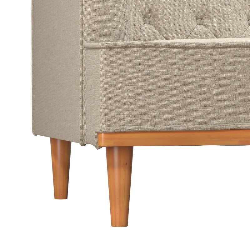 This upholstered sofa provides more seating options. The beautifully crafted tufted back enhances the sofa’s appeal. This piece has sturdy