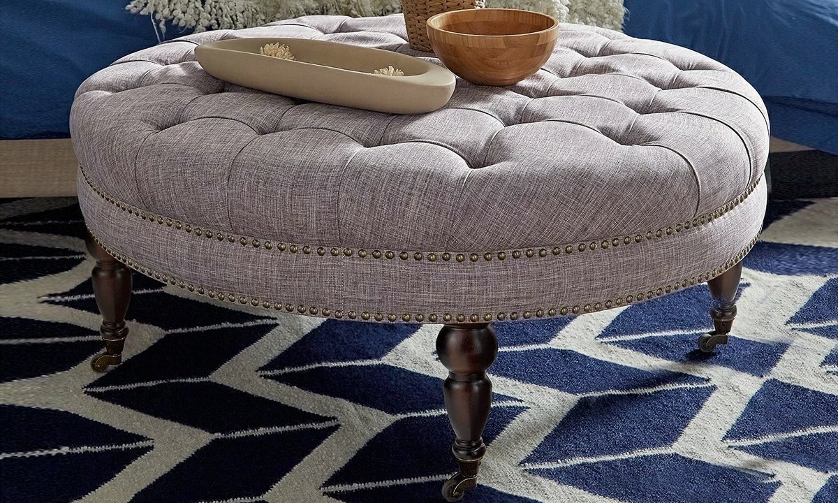 This tufted ottoman offers a novel yet opulent substitute for your wood or metal coffee table. This ottoman gives classic or transitional decor an exquisite touch with its button tufted style and dark-finished legs. This cushioned ottoman may also be used as extra seating when you have visitors for further versatility.