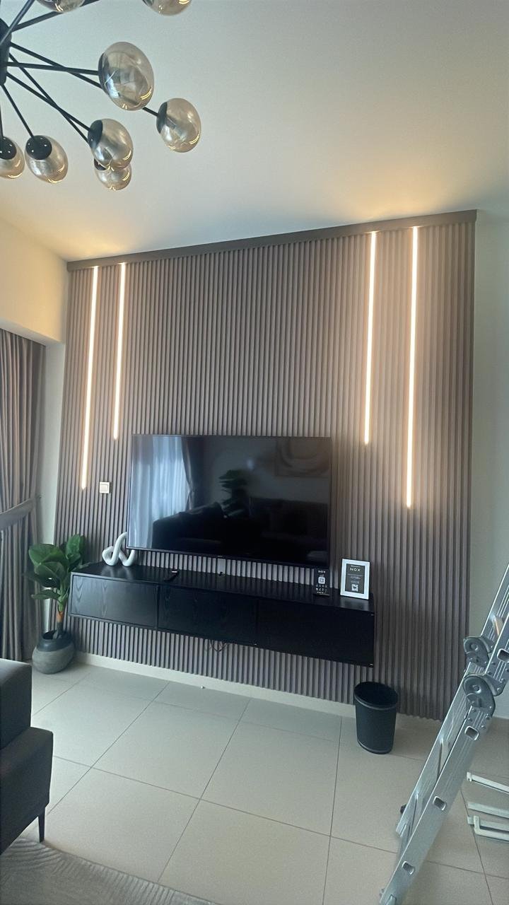 This modern living room showcases a sleek and sophisticated TV feature wall that blends elegance with functionality. The wall is designed with vertical fluted panels in a soft neutral tone, creating visual height and texture while maintaining a minimalist aesthetic. Integrated warm LED light strips run vertically along the wall, adding depth and a subtle ambient glow that enhances the overall atmosphere of the space.