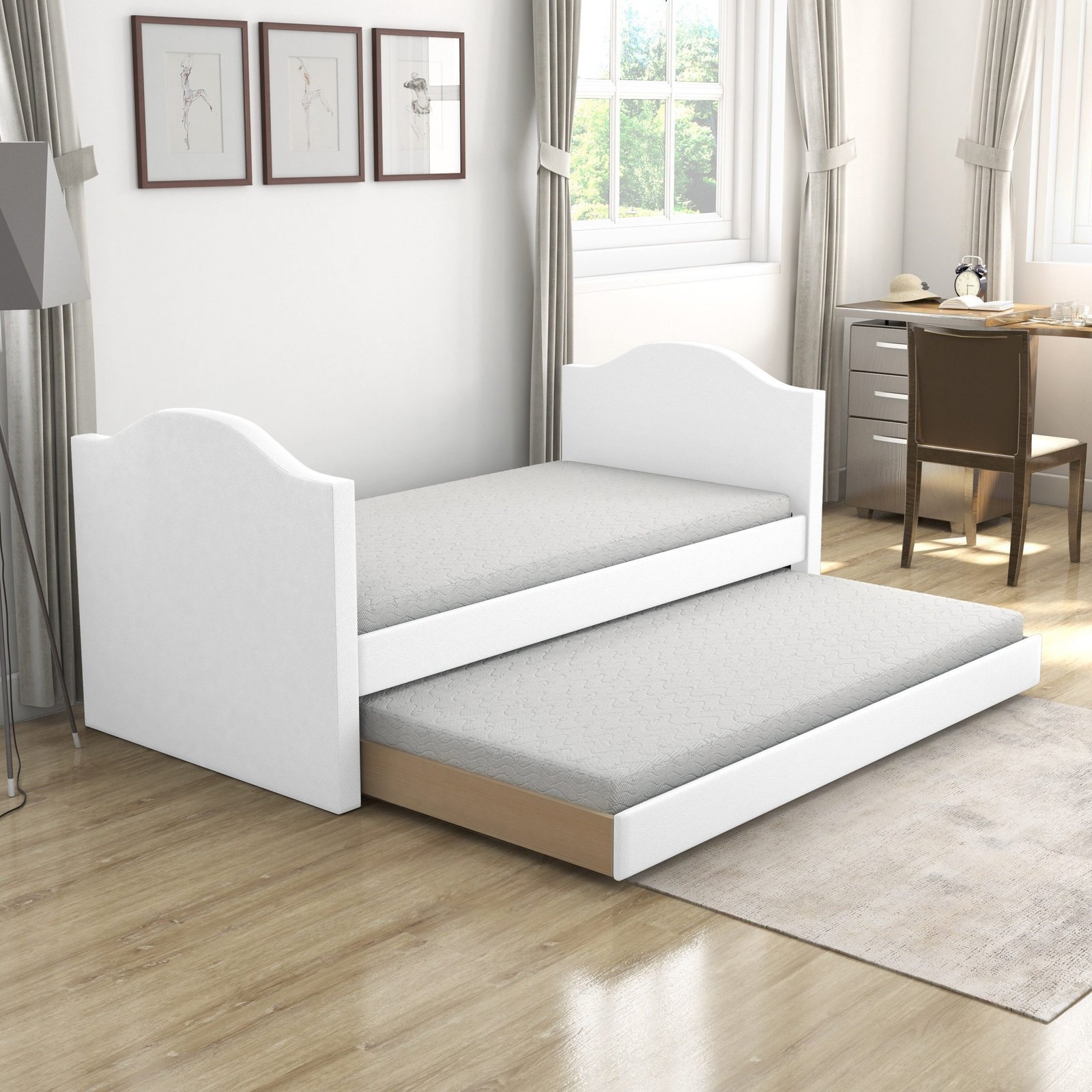 The ideal addition to any room’s furnishings is this lovely daybed with trundle in cushioned fake leather. All forms of dĆ©cor may be complemented by the smooth, gently curved shape, which has a contemporary yet traditional appearance. When not in use, a smooth roll-out trundle mechanism glides away neatly and accommodates either a 6 or 8-inch twin mattress. The Sleep Sync Melody day bed transforms from a stylish sitting choice during the day into a cozy bed at night.