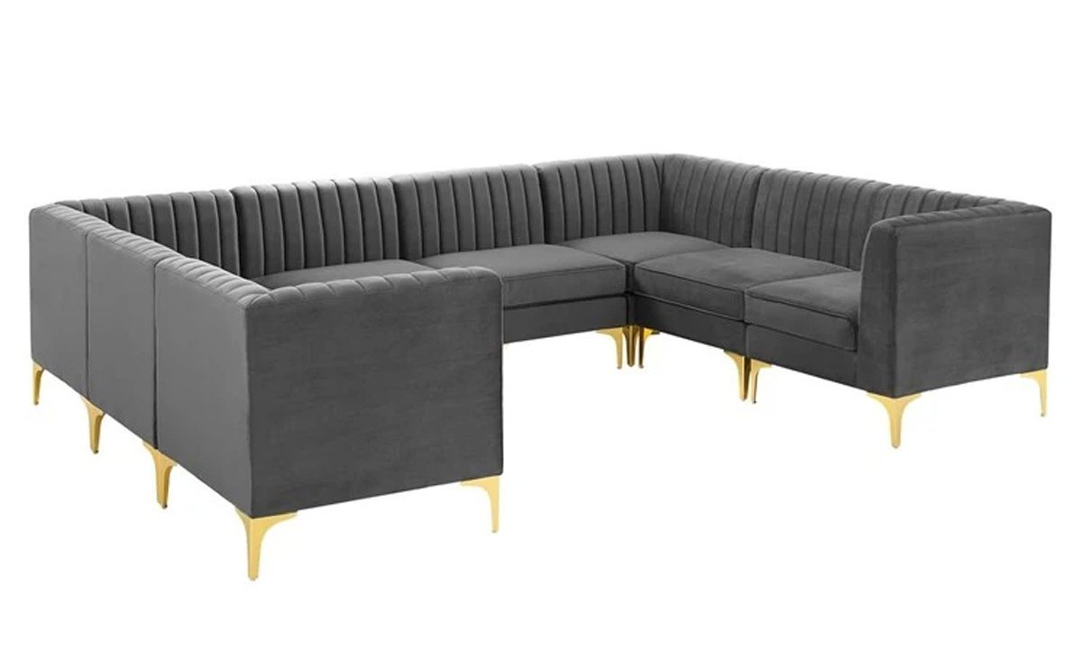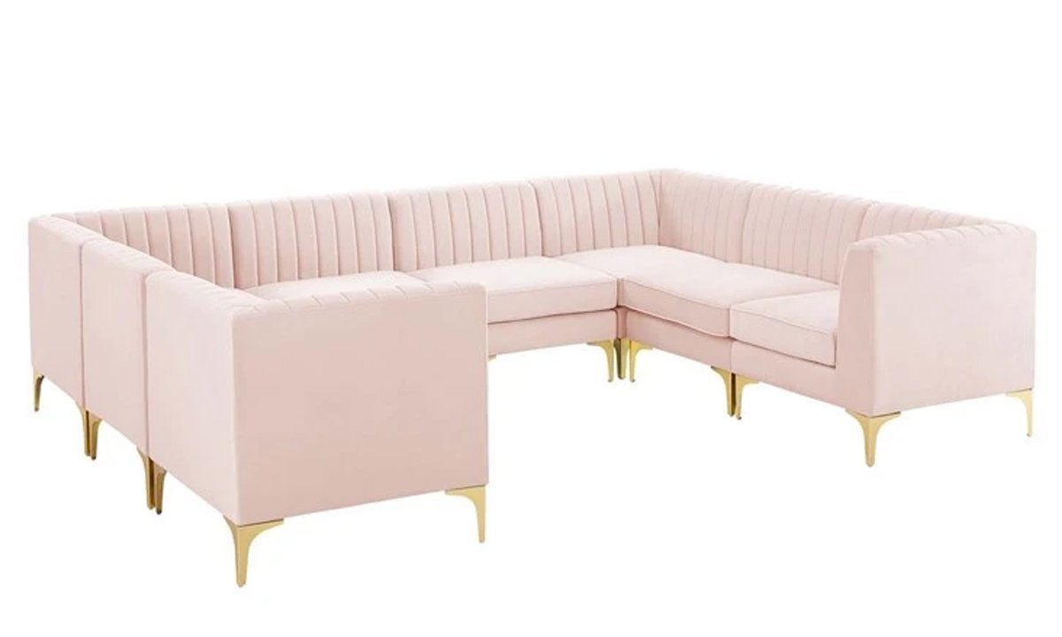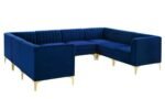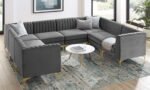 This sofa is part of a line of sectionals that let you put together sitting arrangements for your living room, bedroom, office, foyer, or lounge area. For a luxurious seating experience, this sectional sofa’s upholstery is made of stain-resistant performance velvet, with thick foam cushioning and a sinuous spring support system. The velvet sofa is supported by four gold metal legs with non-marking foot tops.
