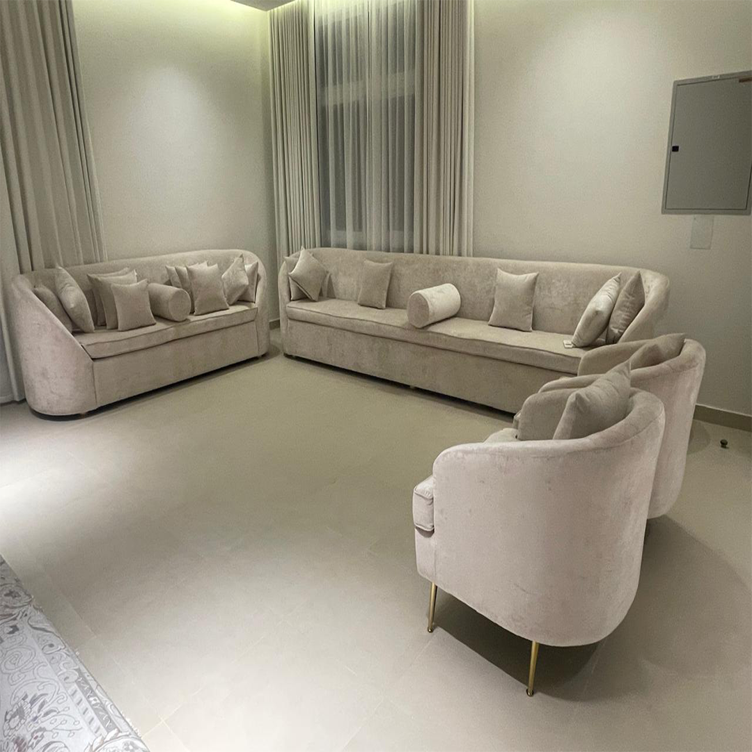 The Veloura Harmony Sofa Collection is crafted to bring refined elegance and balanced comfort to modern living spaces. Featuring soft curved edges, deep seating, and a soothing neutral tone, this sofa set creates a calm and luxurious atmosphere ideal for formal lounges, family living rooms, and upscale reception areas. Upholstered in premium velvet-finish fabric, the sofas offer a smooth touch while maintaining durability for everyday use. The generously padded cushions and supportive backrests ensure long-lasting comfort, making this set perfect for extended seating and social gatherings. Accented with sleek metallic legs, the Veloura Harmony collection adds a subtle modern charm without overpowering the interior aesthetic. Its versatile design blends seamlessly with contemporary, minimalist, and luxury dƩcor styles. Ideal for customers searching for a modern luxury sofa set, curved sofa design, velvet sofa for living room, or elegant lounge seating, the Veloura Harmony Sofa Collection delivers timeless style, comfort, and premium craftsmanship.