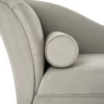This modern velvet chaise, created for tastemakers who appreciate the art of living, adds a touch of glitz to the elegant house. Its sensuous curves, gold cap legs, and fancy pillow make it a must-have for designers. It is upholstered in a luxurious grey color.
