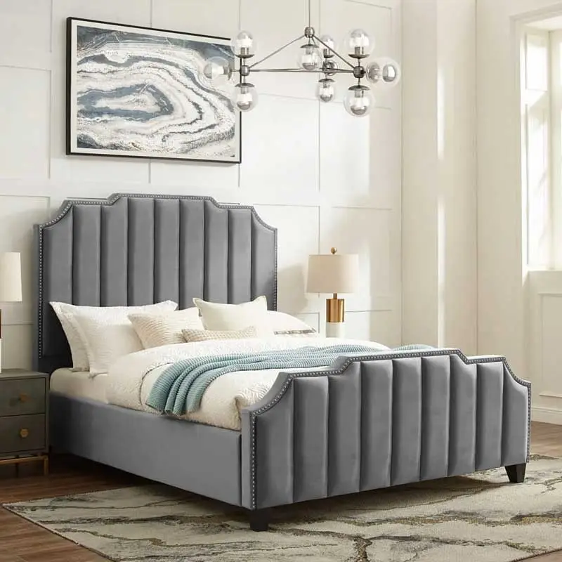 Slumber soundly on this contemporary Vertical Upholstered bed. Your bedroom’s velvet upholstery and foam padding enhance its cozy ambiance, while the headboard’s elegant grey-finished nail head trim adds a touch of refinement. Solid rubberwood and engineered wood are used to create a robust design that can handle regular use.